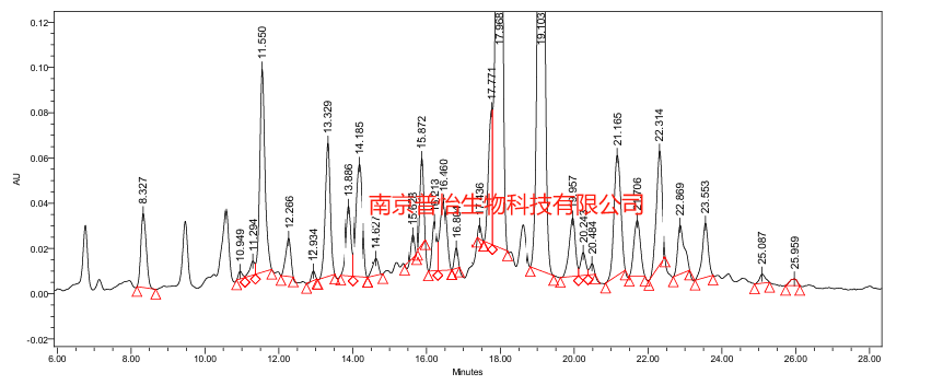色譜圖黃酮色譜峰加以標(biāo)識,共計標(biāo)識出29個黃酮類色譜峰 從放大圖中可以看出,該部分仍有5個非黃酮類化合物,但從峰 面積及峰高判斷,該類化合物占比很小。